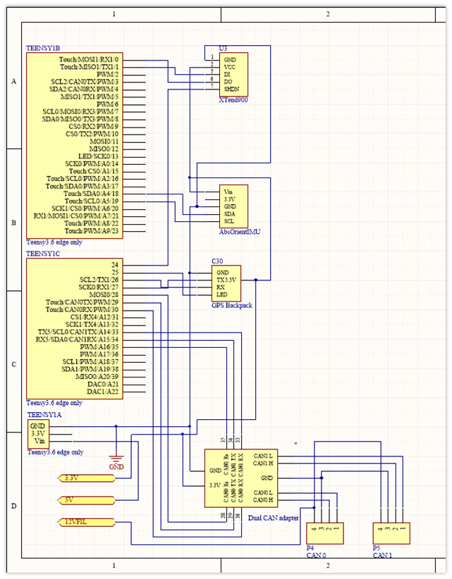 Firstly the functions of the system were finalized. Then after considering different topologies the decentralized system design was chosen to improve redundancy and simplify the wire harness design. After considering protocols such as Local Interconnect Network (LIN) and CAN (Controller Area Network), MOST (Media Oriented Systems Transport), FlexRay, and Ethernet; for the communication protocol of the system CAN was chosen as it has the highest redundancy, Highest compatibility and it is the most widely used automotive communication protocol with a sufficient bandwidth. There are two separate can networks. One for critical engine management which is paired with ECU and other one for the DAQ and auxiliary electrical systems. The system was designed with different independent nodes with different tasks connected by CAN bus. As an example suspension data such as damper displacement, tyre patch temperature, break temperature and wheel speed are obtained from a node attached to each upright. Further the system has a custom dashboard and a main node with IMU, GPS and data logging functionality. All the other systems are interconnected and communicate through CAN bus.