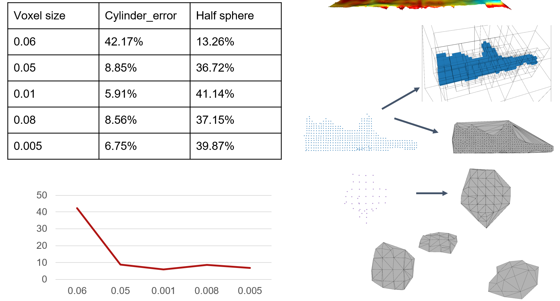 - Voxel-Aided Triangulation: Voxelizes the anomaly cloud, triangulates points for rough surface reconstruction, and calculates volume under triangles. Pros: Faster (0.3–1s). Cons: Inconsistent for spherical anomalies. Error: 1.2–6.5 cm³.